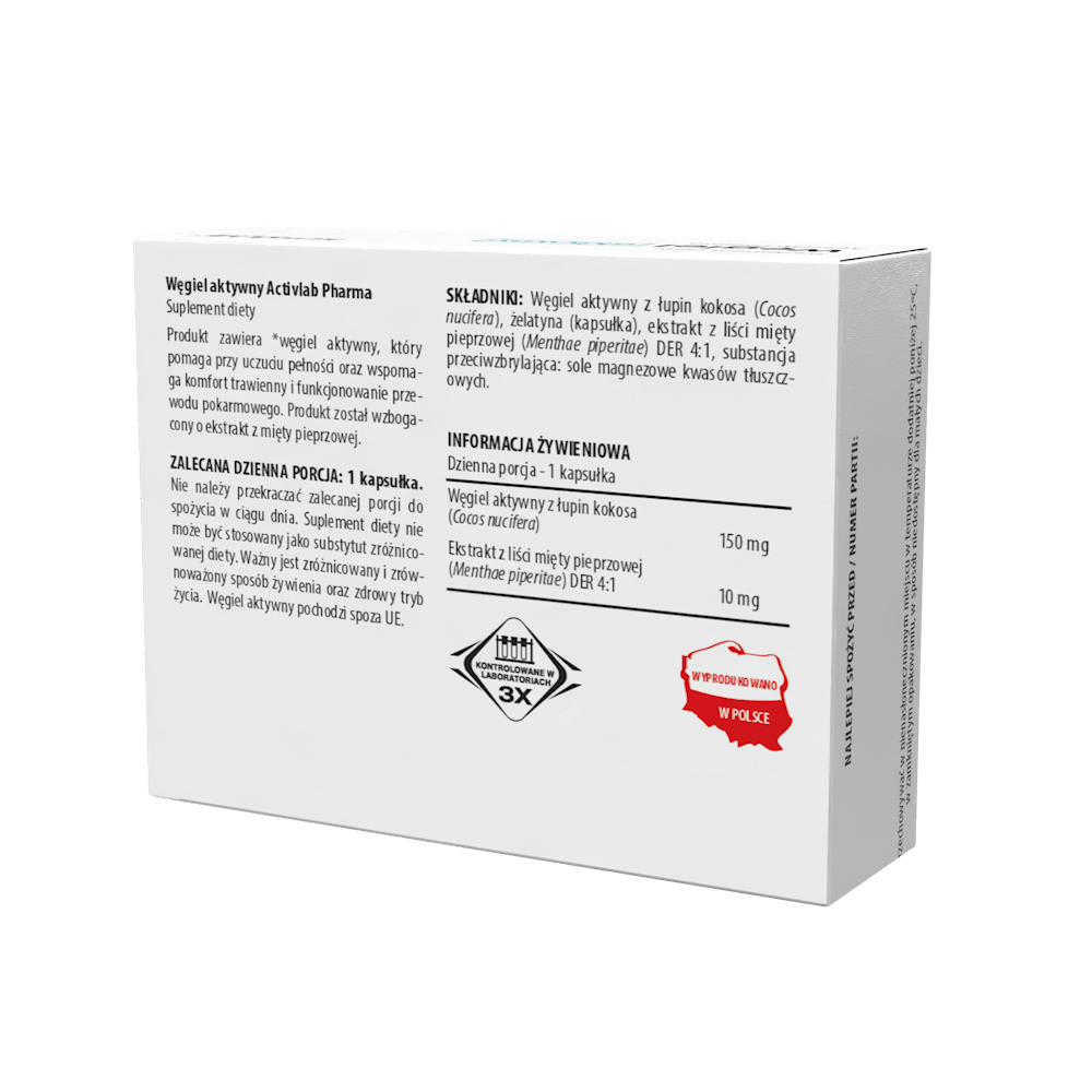 Activated carbon from coconut shells (Cocos nucifera), gelatin (capsule), peppermint leaf extract (Menthae piperitae) DER 4:1, anti-caking agent: magnesium salts of fatty acids.