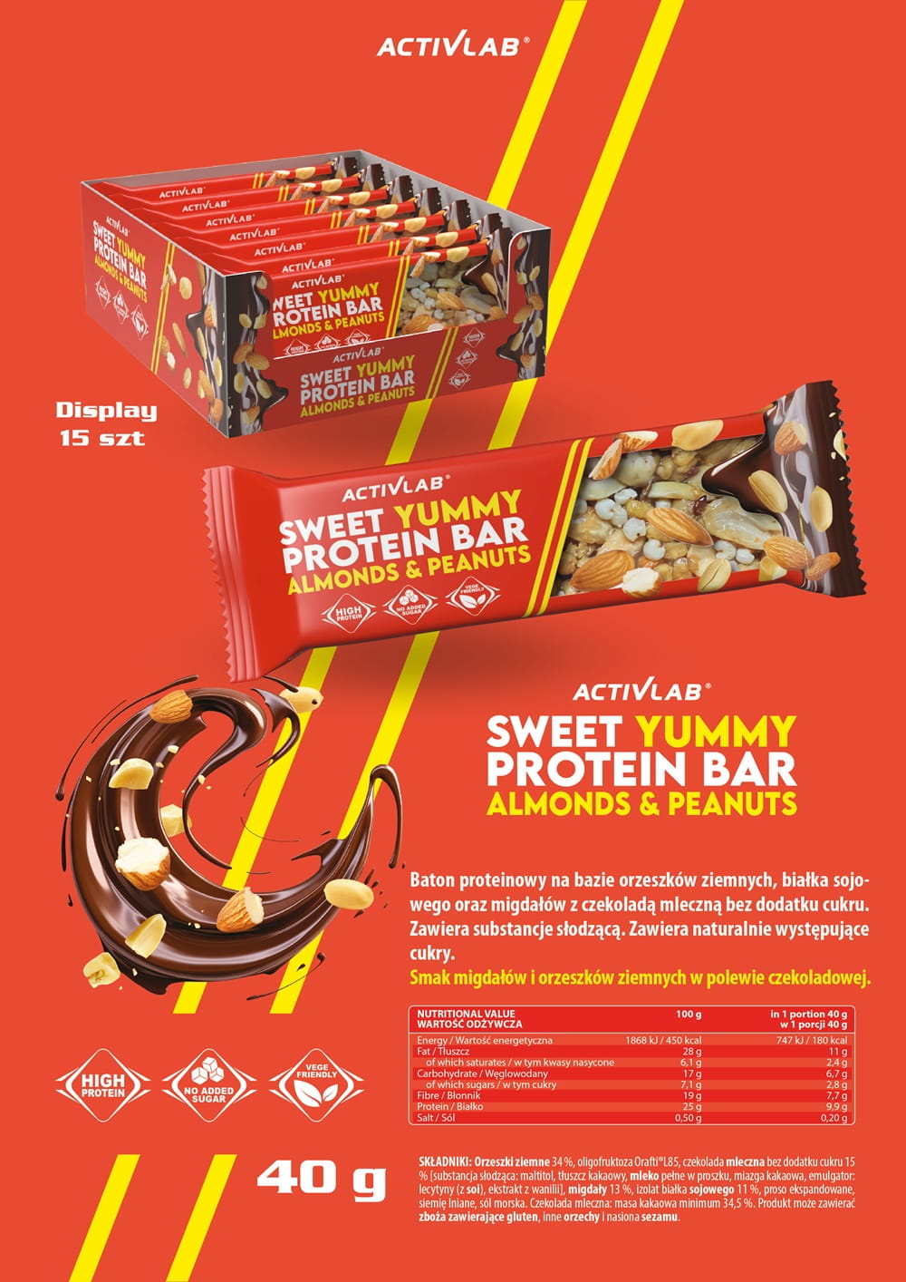 Protein bar made from peanuts, soy protein, and almonds with milk chocolate, no added sugar. Contains sweetener. Contains naturally occurring sugars. A varied and balanced diet and a healthy lifestyle are important.